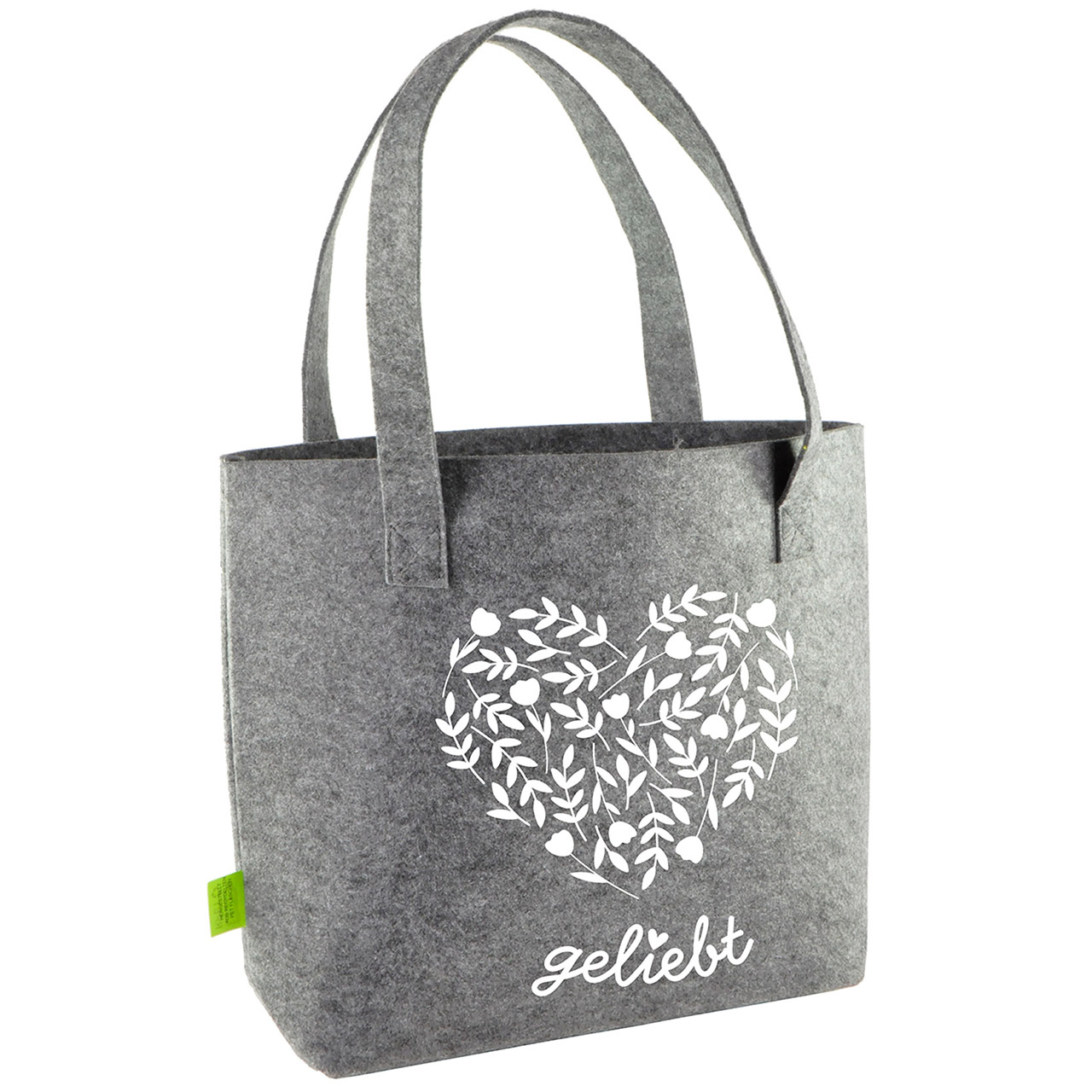 Großer Shopper aus recyceltem PET-Filz mit Bodenfalte und zwei langen Tragehenkeln. Das elegante Siebdruck-Motiv veredelt den robusten Einkaufsbegleiter.