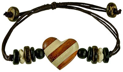 Mit Liebe zum Detail gearbeitetes Armband, mit verschiedenen Perlen und Holzapplikation an einem größenverstellbaren Baumwollband.